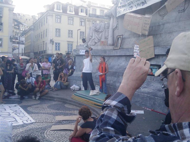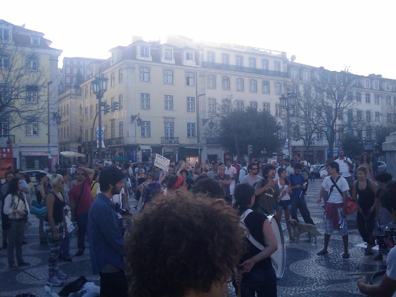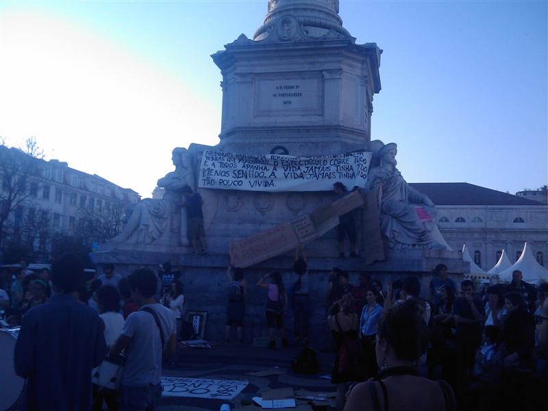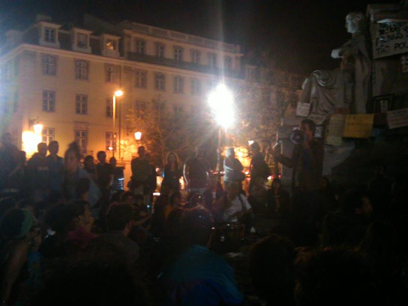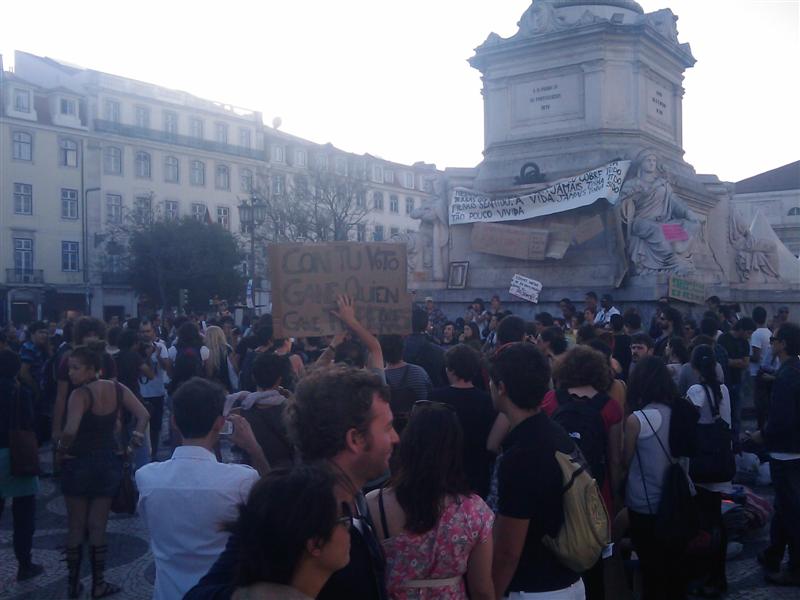 Cargados con los bártulos (colchones, moqueta -¿moqueta? Sí: moqueta, como la de la foto de arriba-, comida, botellas de agua, etc.) y las pancartas que llevó la gente (¿Lemas? Cada cual escribió el suyo o los suyos: Revolução cidadã já; Te va a votar tu puta madre; Solidariedade e luta contra os estados; Si votar cambiara algo, estaría prohibido; Somos movimiento / No partido político / No sindicato / No banderas; Vamos ocupar os bancos e o pingo doce; Santander, BBVA, pagar vuestra estafa, ladrões; Revolución; Con tu voto, gane quien gane, tú pierdes; A banqueros salváis, a pobres robáis; Pienso, luego estorbo; Com o teu voto, ganhe quem ganhar, tu perdes; Esta não é a nossa dívida; Se votar mudara algo, seria proibido; O te indignas / O te resignas / ¡Por un cambio real!; Polícia, junta-te à luta; Nenhum fantasma percorre Europa. Já não há terras que percorrer. O espectáculo cobre tudo e a todos apanha. A vida jamais tinha sido menos sentida. A vida jamais tinha sido tão pouco vivida; Todos juntos!; A revolução esta aqui e precissa de ti; Estamos hartos de ser siempre el futuro: somos el presente; No somos antisistema: el sistema es antinosotros; Não vamos pagar a dívida; Quero viver; Resistir es crear. Crear es resistir; ¡¡¡Estoy más que harta y no quiero seguir soportándolo!!!; Podemos mudar; etc.), bajamos hacia Rossio, quizá cincuenta u ochenta personas, decena arriba, decena abajo. No las conté. Lo único que conté fue cuántos dormimos allí esa noche: 37.